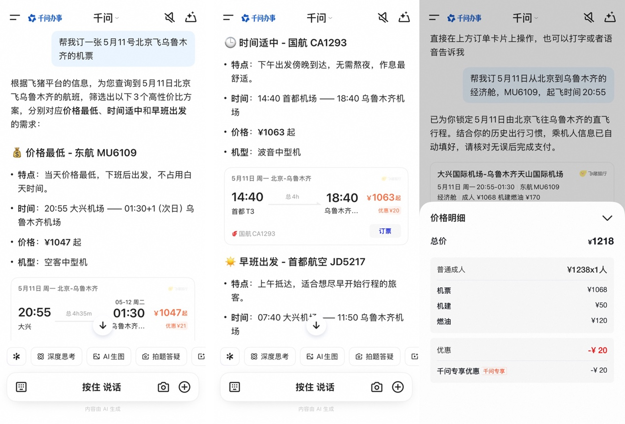 在今年“五一”,用户只要对千问APP说“帮我订一张5月11日北京飞乌鲁木齐的机票”,它即刻理解用户意图并推荐了JD5217、CA1293、MU6109三个不同时刻起飞的航班,3张机票均显示有20元左右的“千问专享优惠”,点击具体航班卡片即可进入确认和支付环节。随着飞猪Agent的接入,AI可以提供的服务体验也越来越深入了。用户可以通过自然语言对话在千问APP内便捷选择酒店房型,发生需求变化时,还能让它修改已经生成的订单、帮忙退订、查询退款进度等。