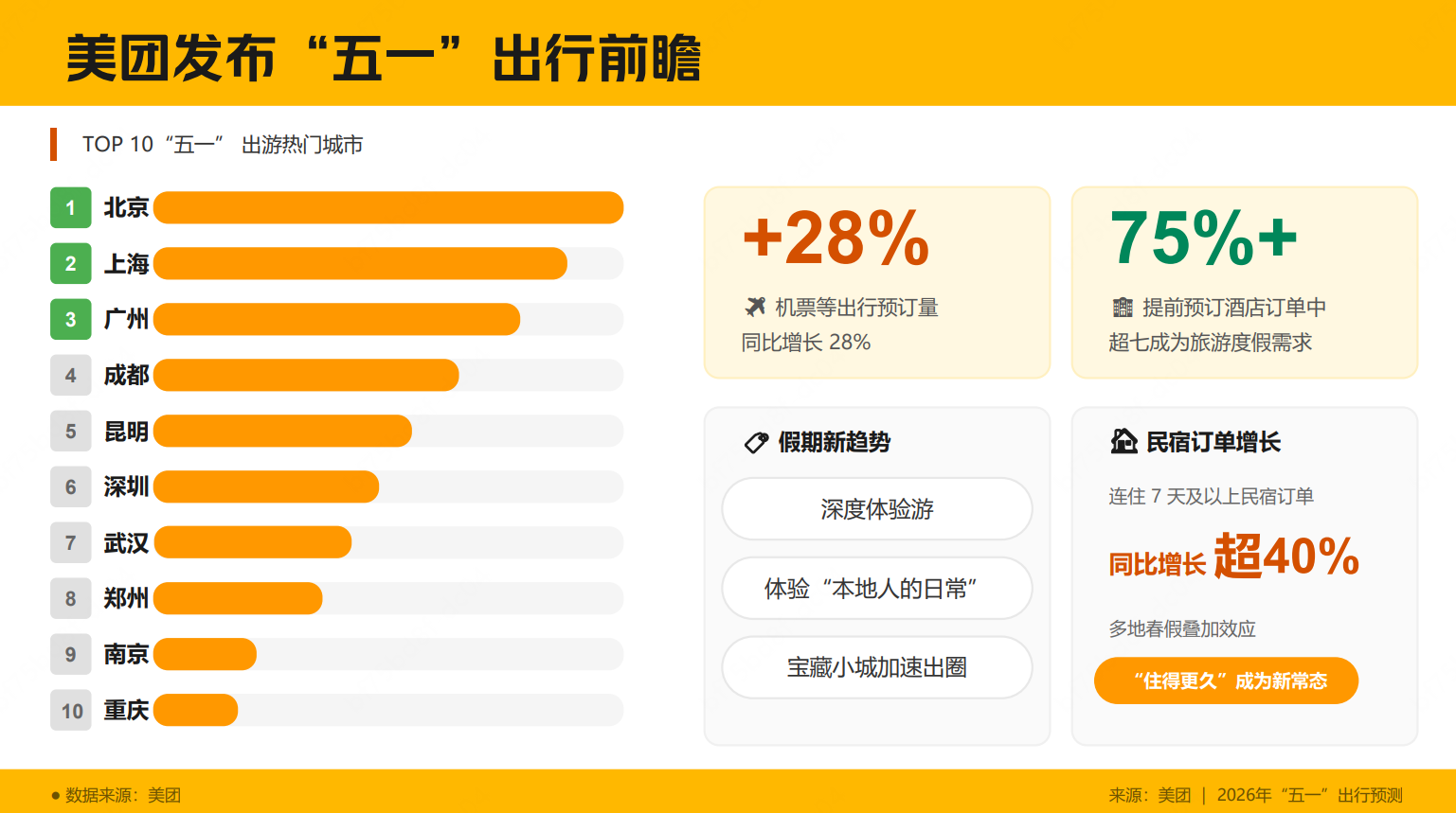 据美团发布的数据显示,“五一”期间,机票等出行预订量同比增长28%。出行目的地选择方面,一线及新一线城市仍是主要出游目的地,广州、深圳入围“五一”热门出行目的地Top10。